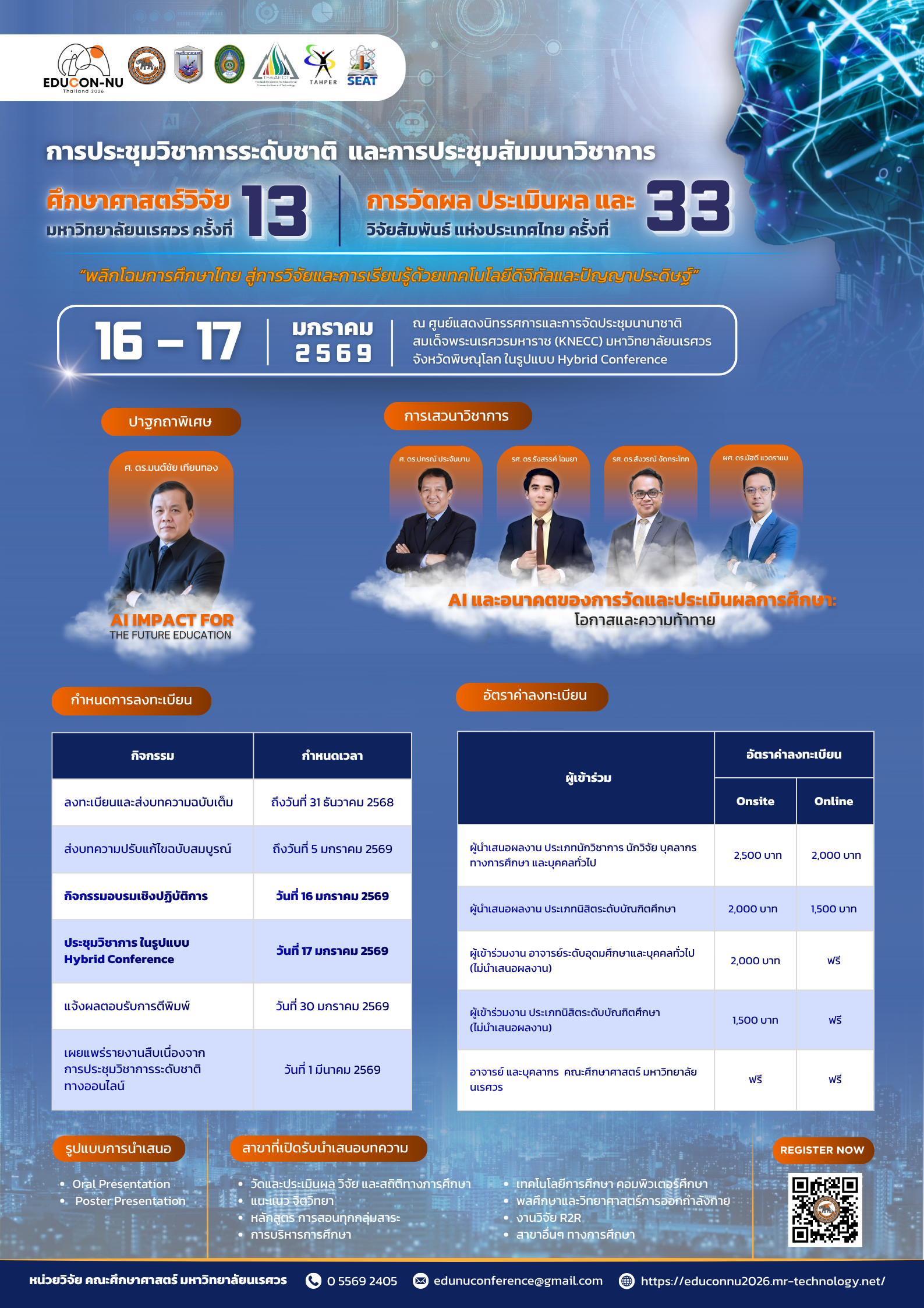 หัวข้อ: “พลิกโฉมการศึกษาไทย สู่การวิจัยและการเรียนรู้ด้วยเทคโนโลยีดิจิทัลและปัญญาประดิษฐ์” วันที่ 16 – 17 มกราคม 2569