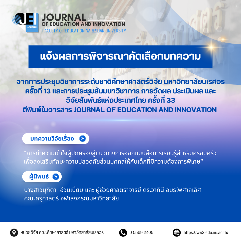 ตีพิมพ์ในวารสาร Journal of Education and Innovation บทความวิจัยเรื่อง “การทำความเข้าใจผู้ปกครองสู่แนวทางการออกแบบสื่อการเรียนรู้สำหรับครอบครัวเพื่อส่งเสริมทักษะความปลอดภัยส่วนบุคคลให้กับเด็กที่มีความต้องการพิเศษ” (Understanding Parents as a Basis for Designing Family-Based Learning Materials to Promote Personal Safety Skills in Children with Special Needs)